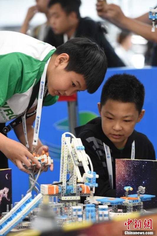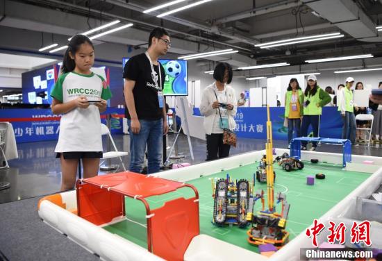 两名小选手在2019世界机器人大赛“青少年机器人设计大赛”中操控自己设计的机器人。
