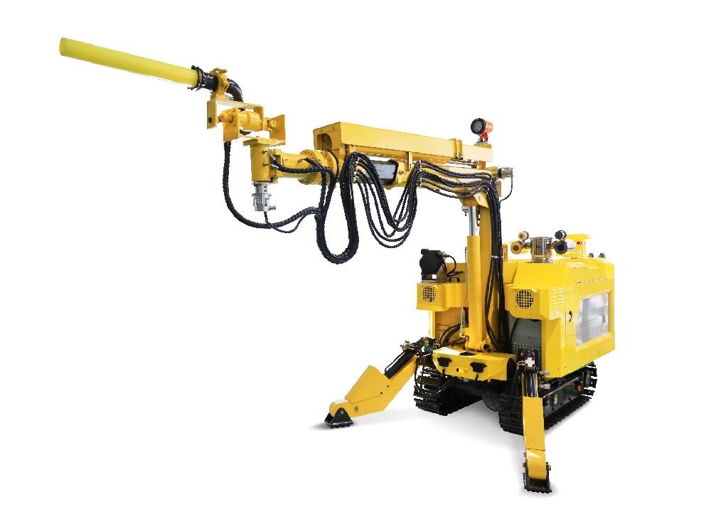 喷浆机器人主要由机器人底盘、喷浆机械手、视觉系统、 感知系统及控制系统等部分组成。采用动力强劲的液压驱 动履带式底盘,配有内藏式低速大扭矩马达行走减速机, 具有高通过性能、噪音低、运行平稳的性能,通过三维激 光导航技术,可在井下复杂地面环境中实现自主规划路径 行走。