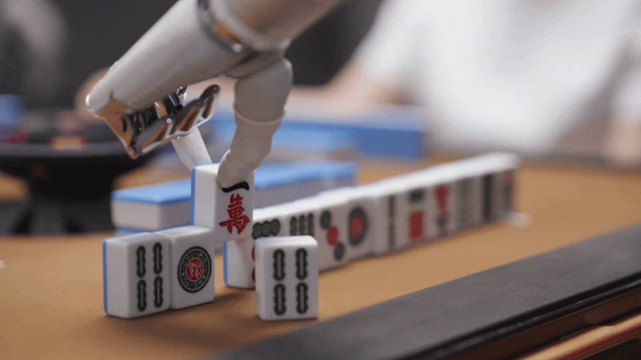 灵初智能麻将机器人与现场观众同桌博弈的场景吸引了众多参观者围观。机器人可与现场观众共同完成30分钟以上的连续麻将对局,以毫米级精度完成摸牌、放置、碰杠等复杂操作,在与人类玩家的实时博弈中展现策略思考,动态构建决策链,自主完成碰杠等博弈决策。观众不仅可以现场观看,更能亲自上桌与机器人对弈,体验机器人如何融合视觉、语言与动作信息,形成游戏博弈和具身操作的融合,展示真正意义上的"会思考的手"。