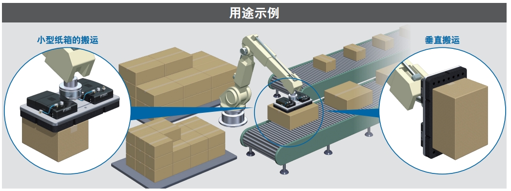 ・真空发生器单元(真空发生器、供给阀・破坏阀、消声器、压力传感器) ・仅需连接1根电线和气管,即可立即使用 ・对应4家公司的协作机器人 优傲、欧姆龙/TECHMAN ROBOT、FANUC、 安川电机 ・吸吊力: 440N(200×120)(-63kPa时);880N(300×180)(-63kPa时);2144N(400×240)(-75kPa时) ・对应IO-LINK