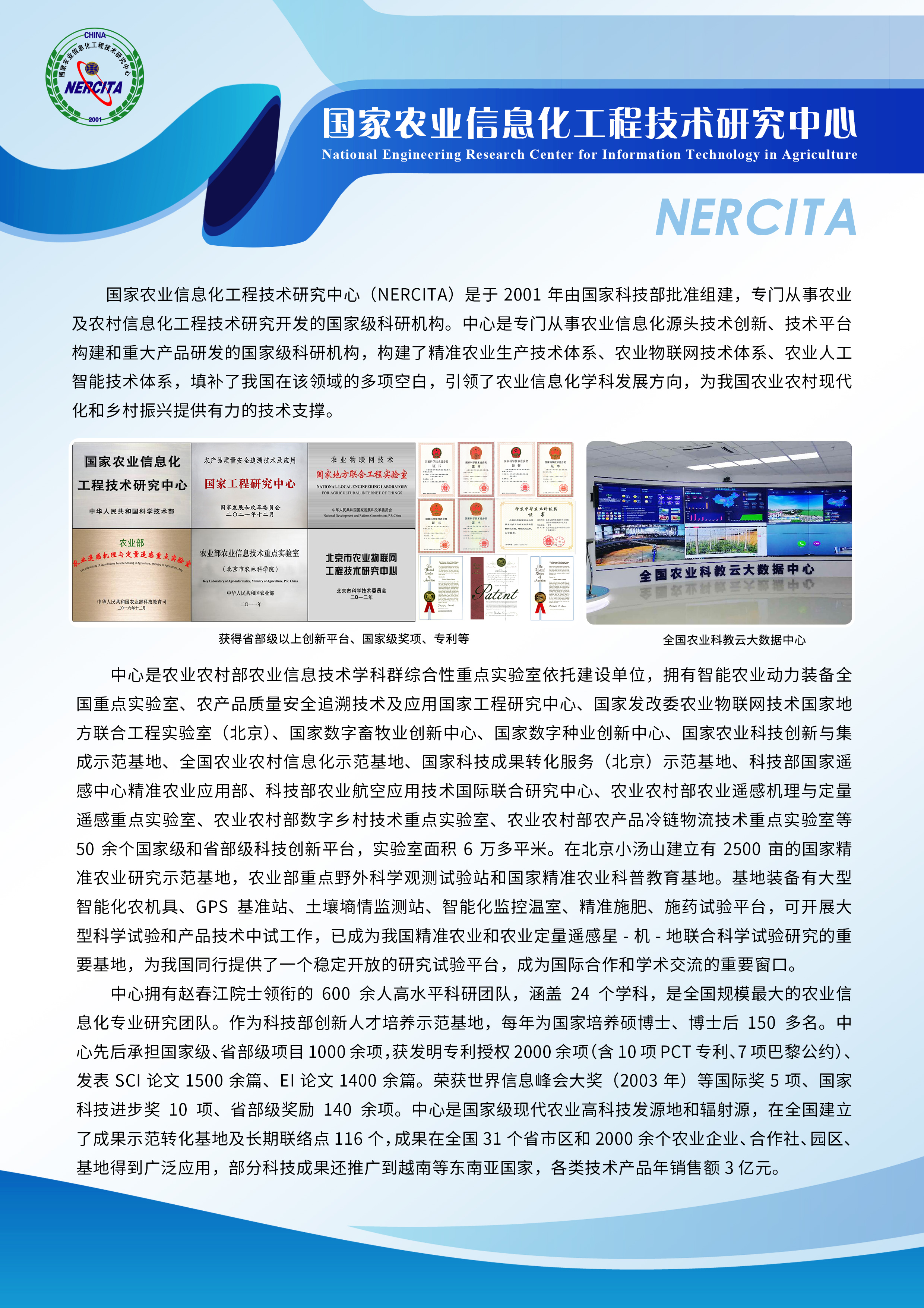 National Engineering Research Center of Intelligent Equipment for Agriculture (NERCIEA) was established in 2009 on the basis of Beijing Research Center of Intelligent Equipment for Agriculture. According to the development trend of world agricultural intelligent equipment and China’s needs of modern agriculture, NERCIEA is engaged in solving the key, fundamental and common technical problems in the field of intelligent agricultural equipment. It focuses on establishing of digital design and test platform of agricultural intelligent equipment, making breakthrough in the key techniques of designing, processing and manufacturing of intelligent agricultural equipments, as well as developing various intelligent agricultural equipment products to meet the needs of different agricultural production scales and management patterns, which provide a solid technical support for the development of modern agriculture and enhance the technical level of intelligent agricultural equipment in China.