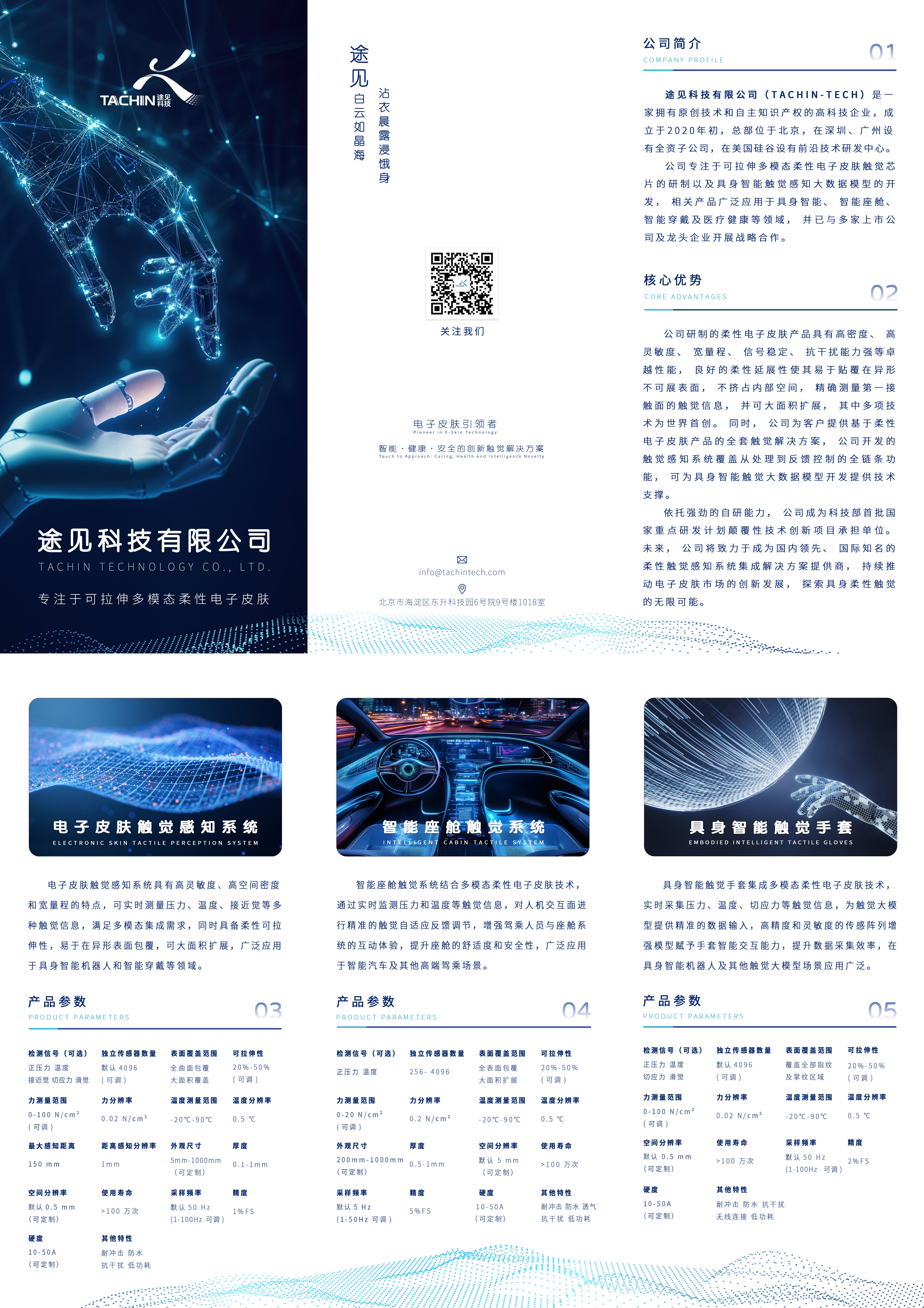 Tachin-Tech Co., Ltd. is a high-tech enterprise with original technologies and independent intellectual property rights. Founded in early 2020 and headquartered in Beijing, the company has wholly-owned subsidiaries in Shenzhen and Guangzhou, as well as an advanced R&D center in Silicon Valley, USA. Tachin-Tech focuses on the development of stretchable multimodal flexible E-skin systems, tactile sensing chips, and embodied intelligent tactile perception big data models. Its technologies are widely applied in fields such as embodied intelligence, smart cabins, wearable devices, and healthcare. The company maintains deep collaborations with multiple public companies and leading enterprises in the industry.