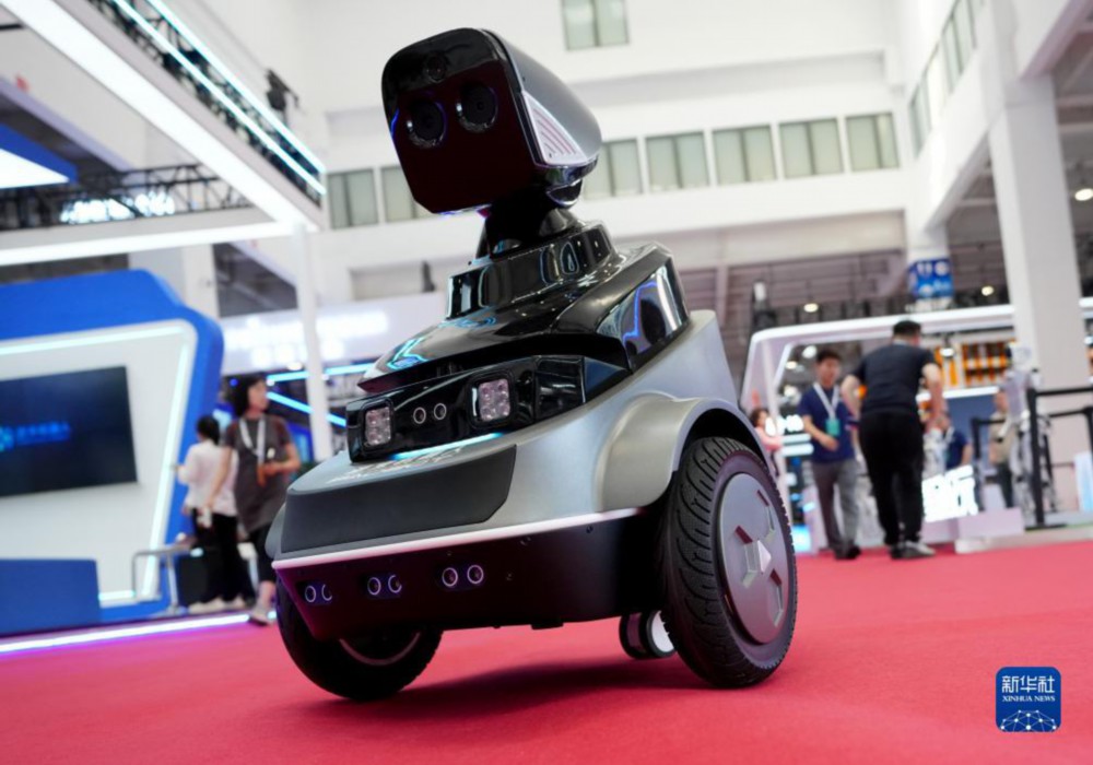 8月16日,在2023世界机器人大会现场,具有防火防盗功能的巡逻机器人在执勤。