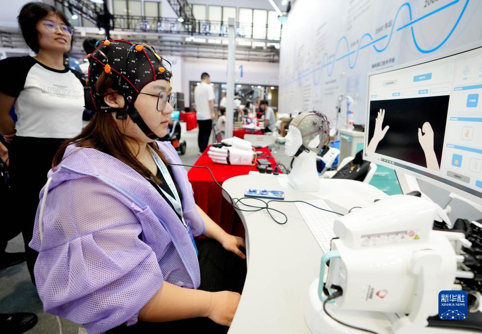 8月16日,工作人员在演示脑机接口智能治疗系统平台。该机器人应用于中风患者手部康复治疗。