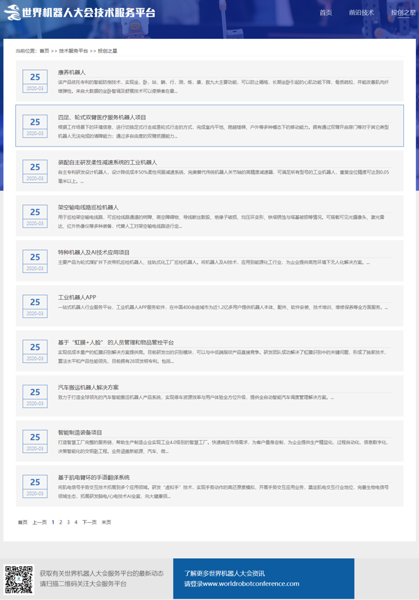 世界机器人大会(WRC)技术服务平台主要分为投创之星和前沿技术两个板块。